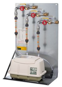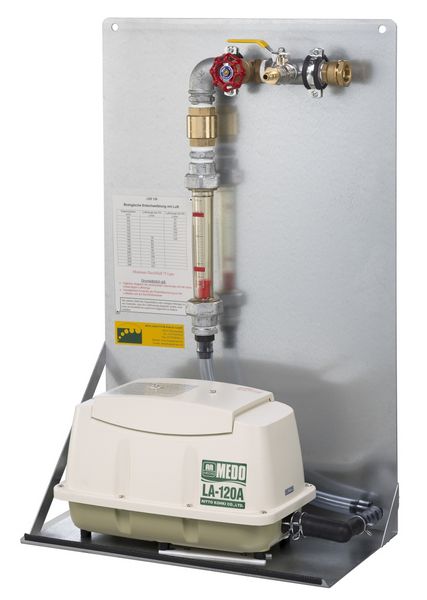 Grandezza 120, fino a ca. 3000 m³ di biogas al giorno, comprendente: indicatori di portata con 3x punte oscillanti fino a 120 l/min, pompa dell'aria lineare LA-120B, 130 W, valvola a farfalla, 3x rubinetto a sfera con raccordo per tubo dell'aria in PE-HD di 20 mm, 3x raccordo per scarico dell'acqua di condensa e lavaggio dei tubi. Incl. manuale d'istruzioni in tedesco. Gli ugelli dell'aria devono essere dotati di sicura di non ritorno!